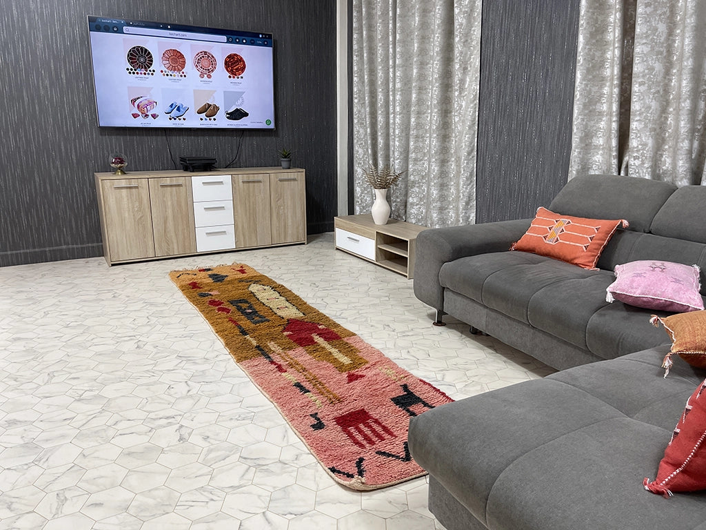 The Ait Ourir Oasis rug beautifully mirrors the region's tranquil landscapes and lush oases. Its soothing patterns and serene hues create a calming atmosphere, offering a respite from the daily rush. Experience the tranquility of Ait Ourir with each step.