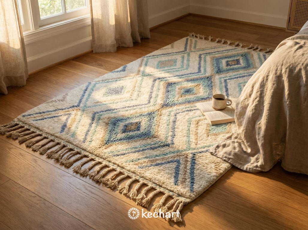 Invite the serene beauty of the Moroccan landscape into your home with this custom-made Beni Ourain rug. A harmonious blend of tradition and contemporary design, this piece reimagines the classic Berber aesthetic with a soothing palette inspired by mountain peaks and coastal horizons. As a made-to-order item, this rug is not merely purchased; it is commissioned especially for your space, ensuring a truly unique artifact of artisanal luxury.