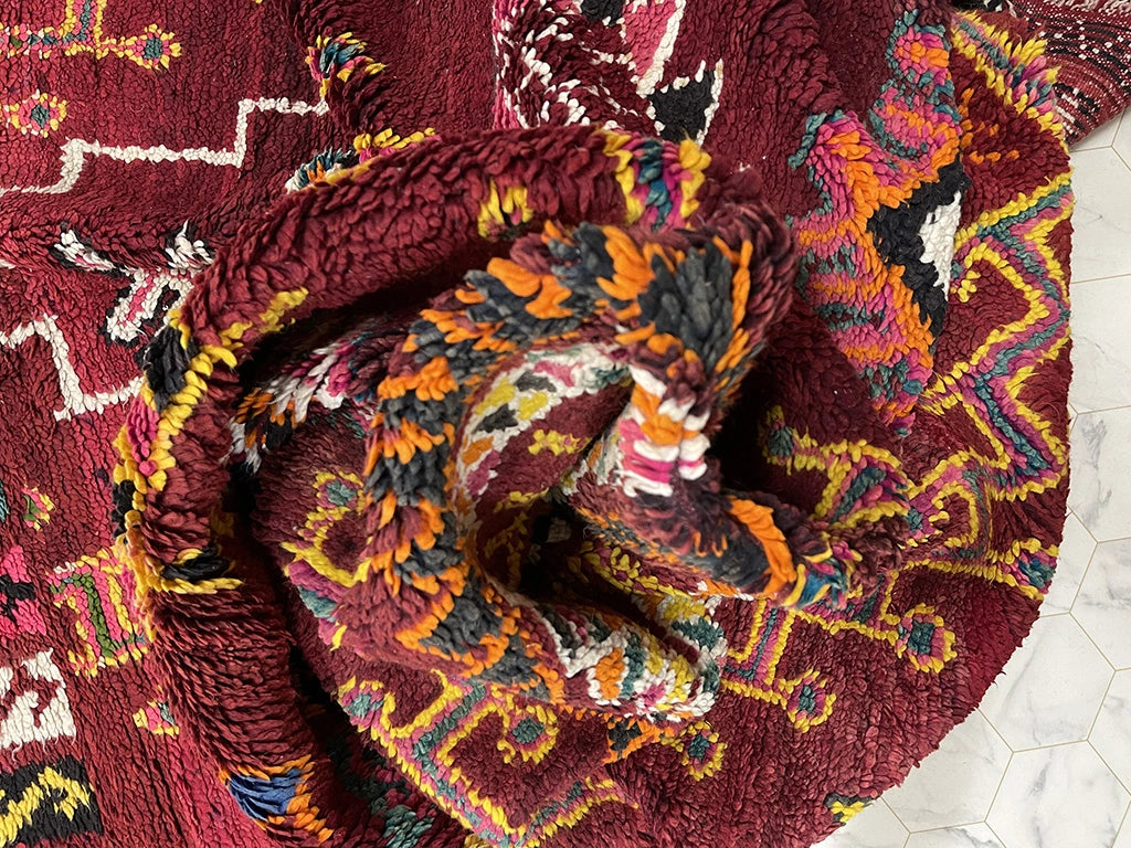 Introducing "Lamlih," a captivating rug that will infuse your space with vibrant colors and cultural charm. With its deep Indian pink background adorned with intricate Berber motifs, shapes, and symbols in a delightful array of colors including black, yellow, orange, pink, white, turquoise, and blue, Lamlih is a true celebration of beauty and culture.