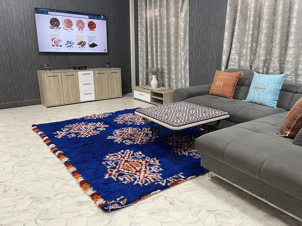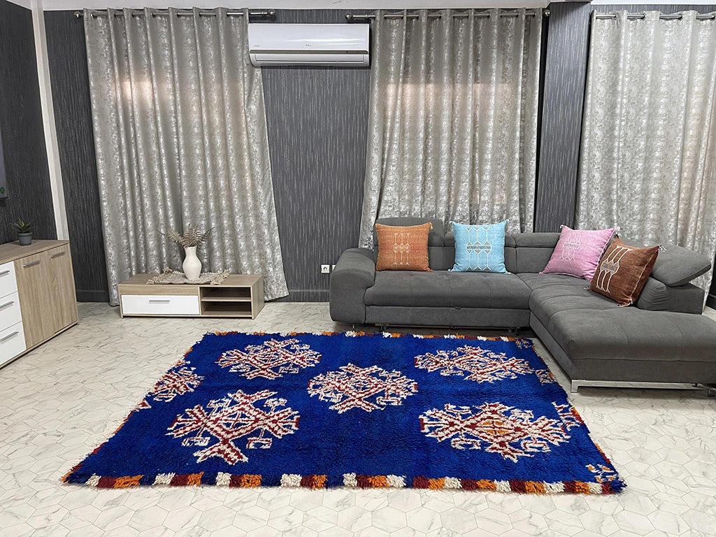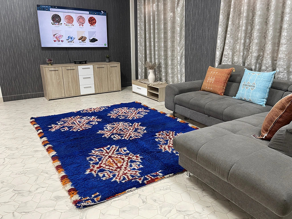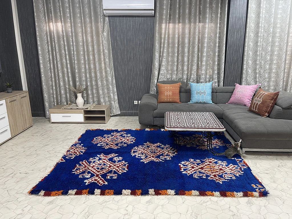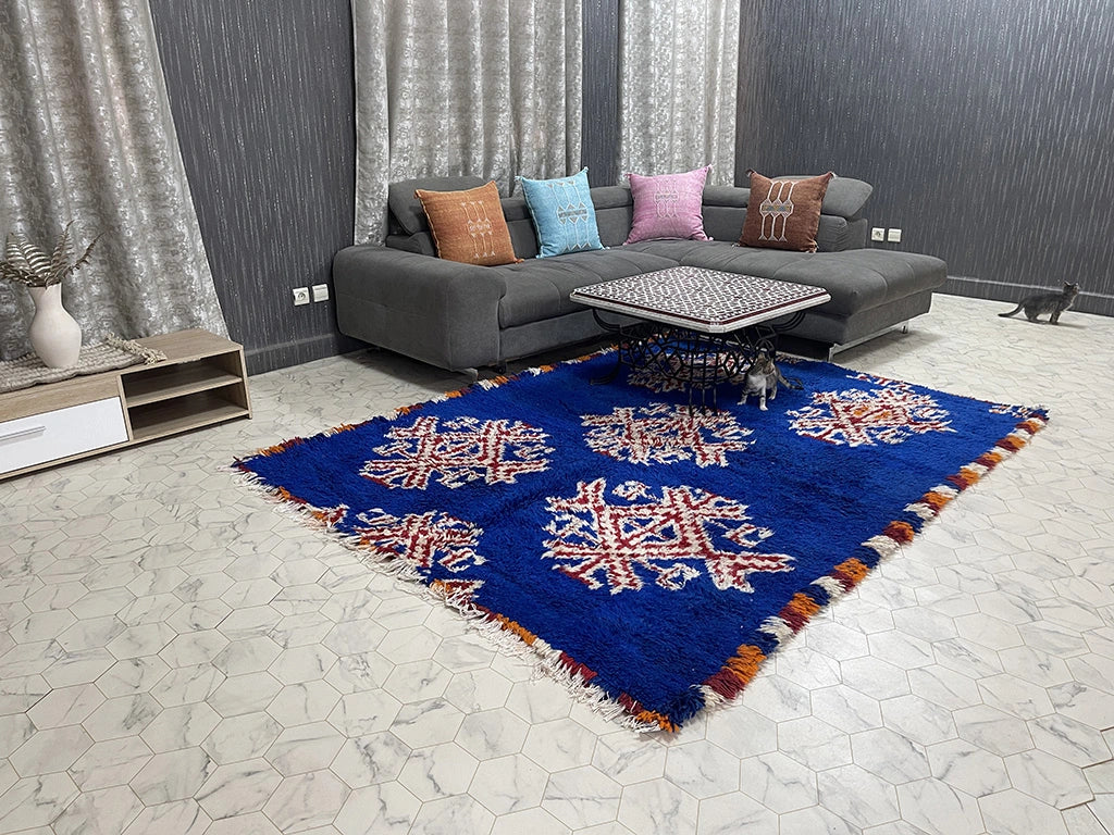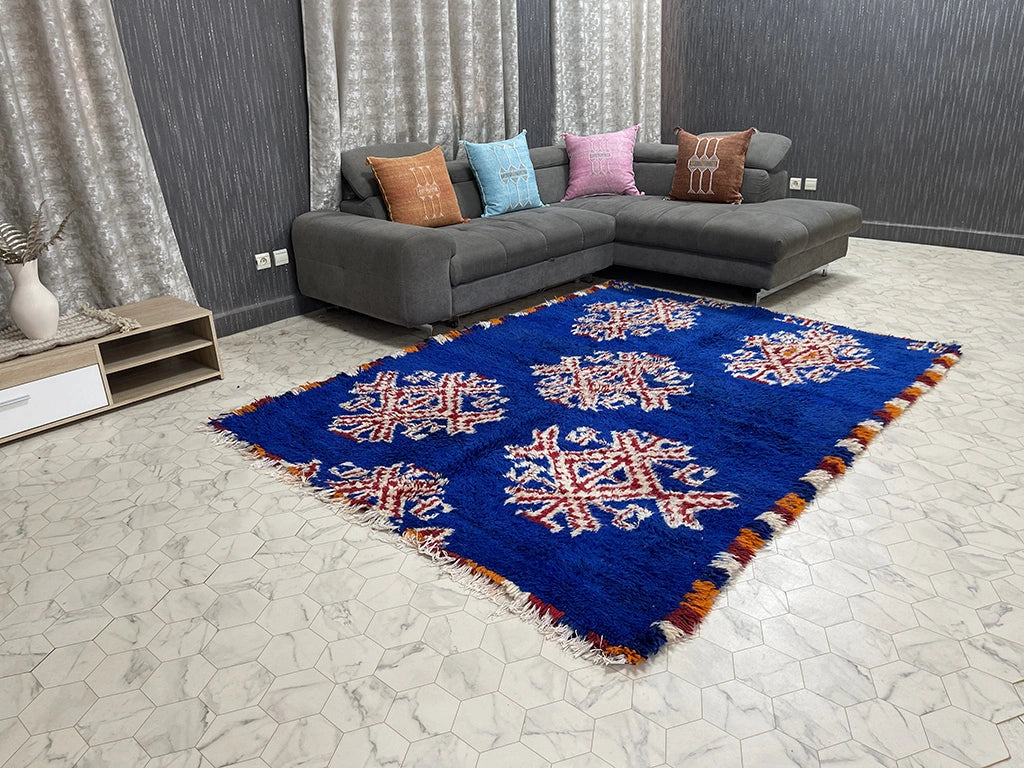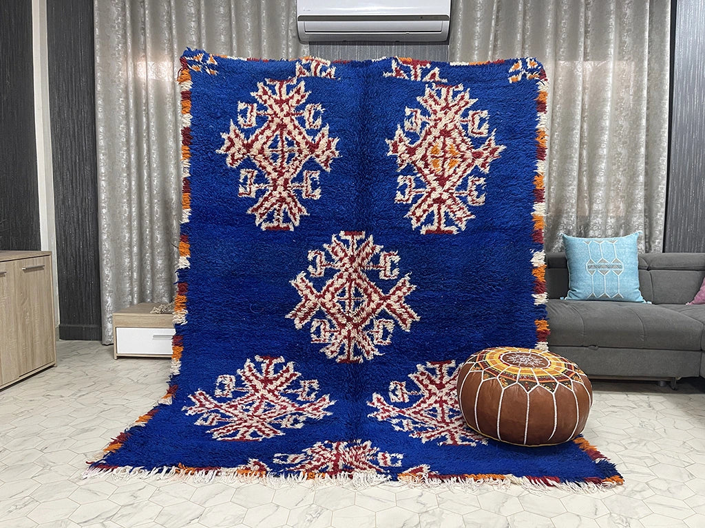 Introducing Malakizrek, the stunning rug that features a royal bright blue background adorned with captivating designs in red and white. Malakizrek creates a visually striking and vibrant ambiance in your space, greeting you with a sense of regality and depth. The royal bright blue background exudes elegance and sophistication, setting a captivating foundation for the intricate designs that adorn the rug.
