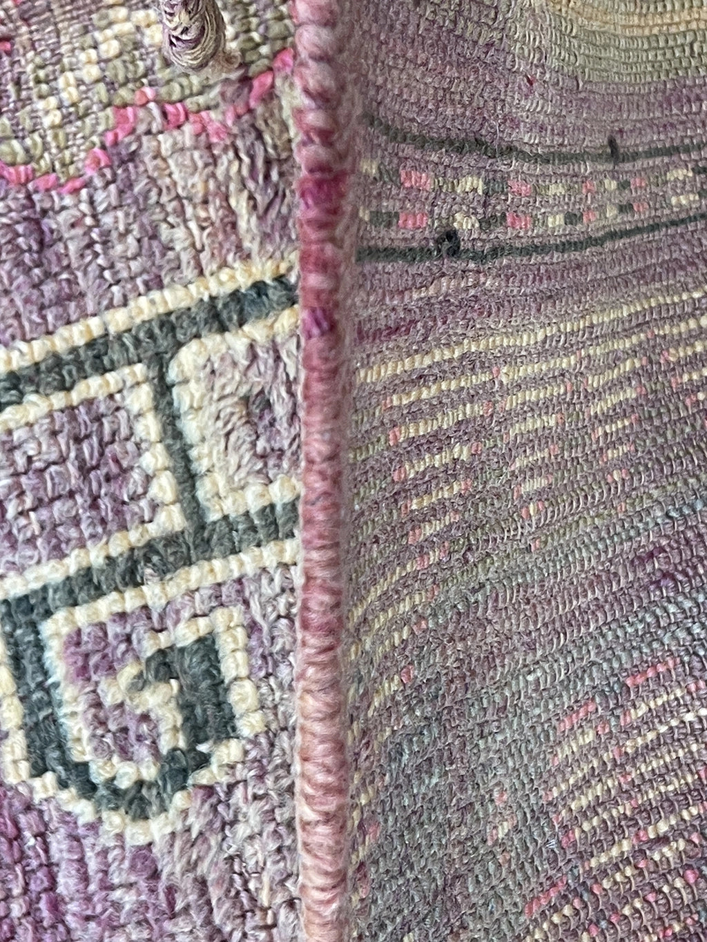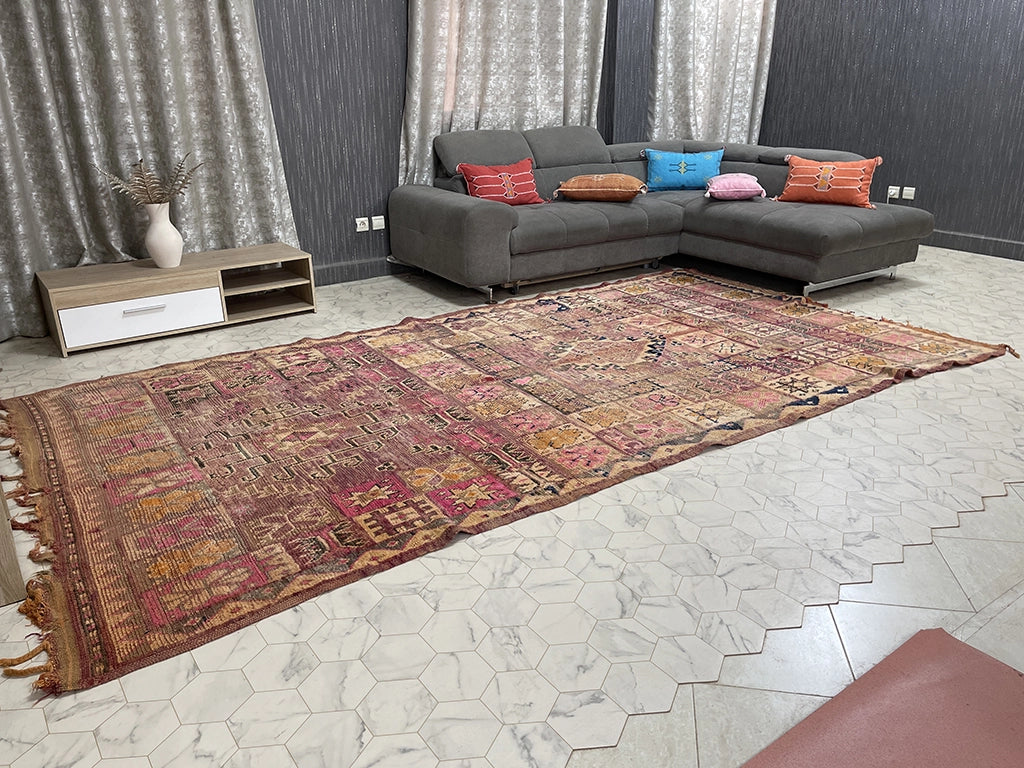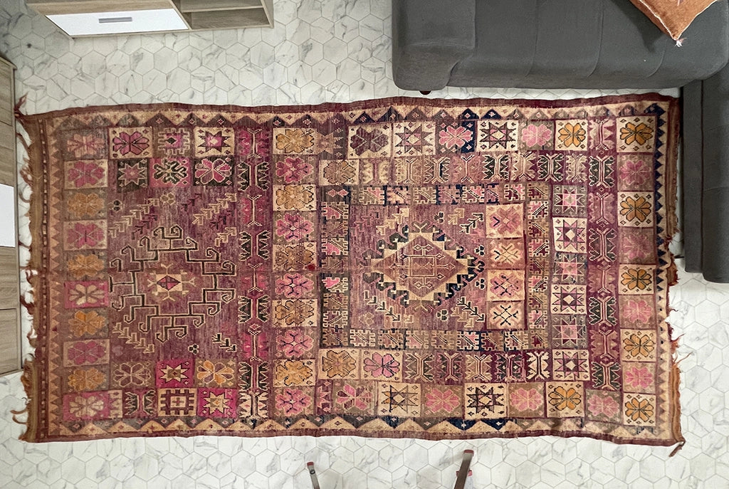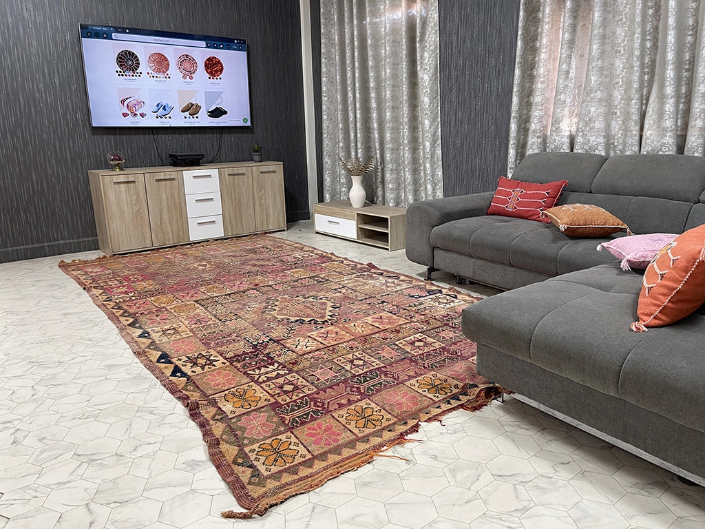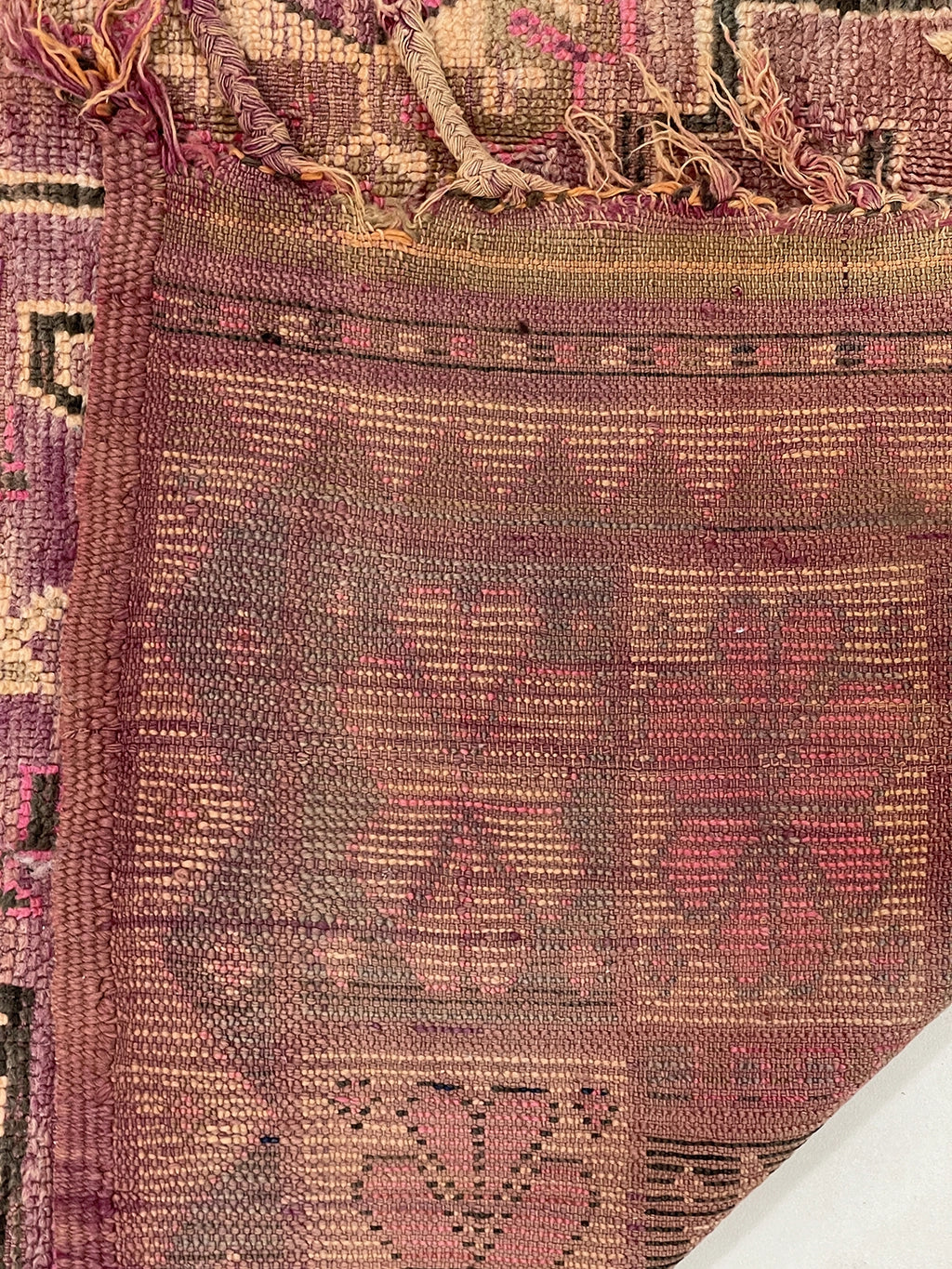 Marhaba Tazakka is a vintage Berber Boujaad rug that embodies the authenticity and rich heritage of traditional Moroccan carpets. With its pale purple, lipstick red, burgundy, and mahogany orange hues, this rug boasts an enchanting color palette that adds warmth and depth to any space.