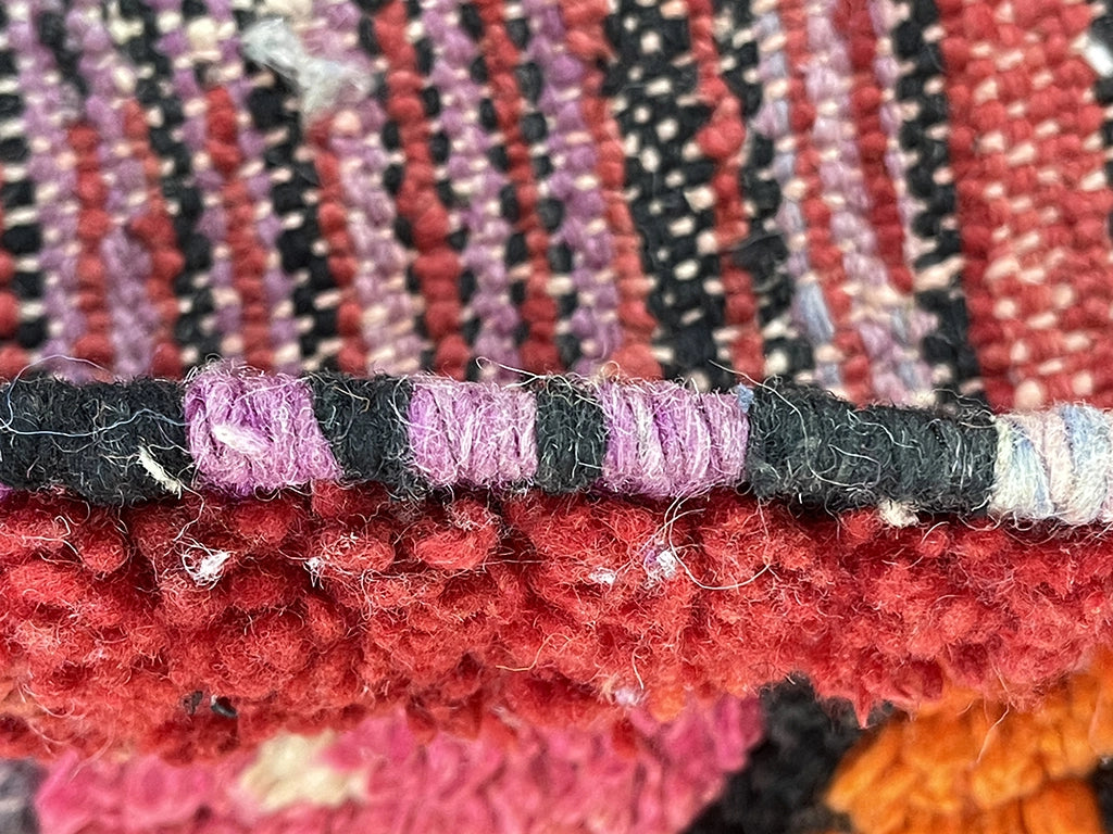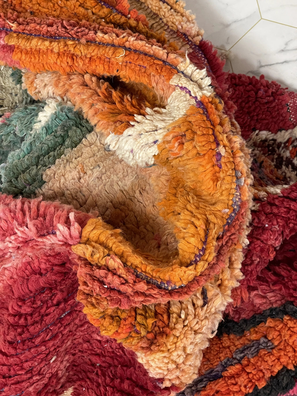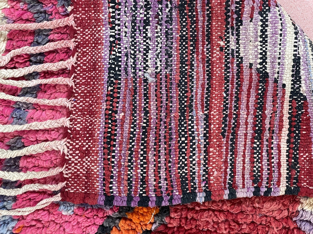 Discover the enchanting mirage of Mhamid with this captivating Boujaad vintage rug, featuring a dreamy fusion of patterns and colors that pay tribute to the region's stunning natural beauty and tranquil ambiance.